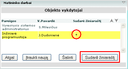 | Vykdytojas, kuris sudarė žiniaraštį, pažymėtas "*" stulpelyje "sudarė žiniaraštį" |
