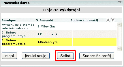 | 1. Pažymėkite vykdytoją, kuri norite pašalinti. Spragtelėkite pele ant reikiamos eilutės. |